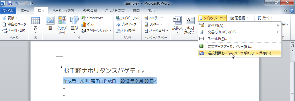 - [テキスト]グループの[クイックパーツ]をクリックし、[選択範囲をクイックパーツギャラリーに保存]をクリックします。