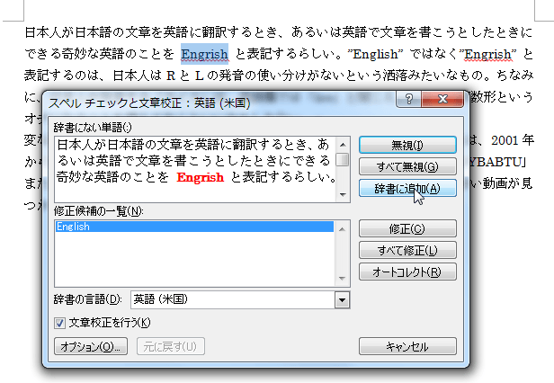 - [スペルチェックと文章校正]ダイアログボックスで、辞書に追加したい語句のところで[辞書に追加]ボタンをクリックします。