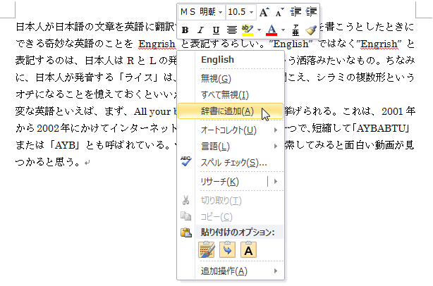 - 単語登録したい語句を右クリックして、ショートカットメニューより[辞書に追加]をクリックします。
