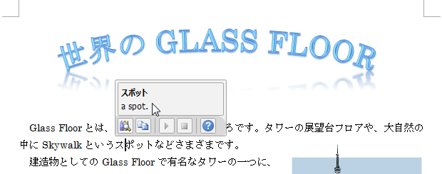 - [ミニ翻訳ツール]にマウスを移動するとはっきり表示され、そこから[リサーチ]作業ウィンドウなどを表示することが可能です。