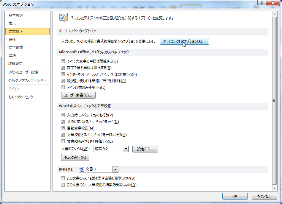 - [Wordのオプション]ダイアログボックスの[文章校正]を開き、[オートコレクトのオプション]ボタンをクリックします。