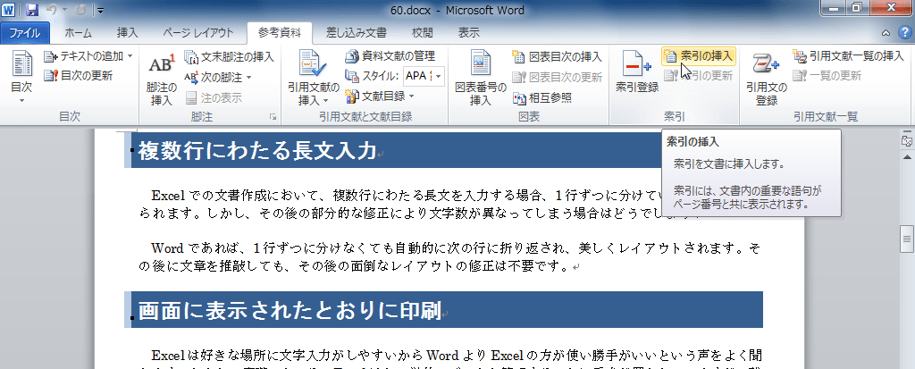 - [参考資料]タブを開き、[索引]グループの[索引の挿入]をクリックします。