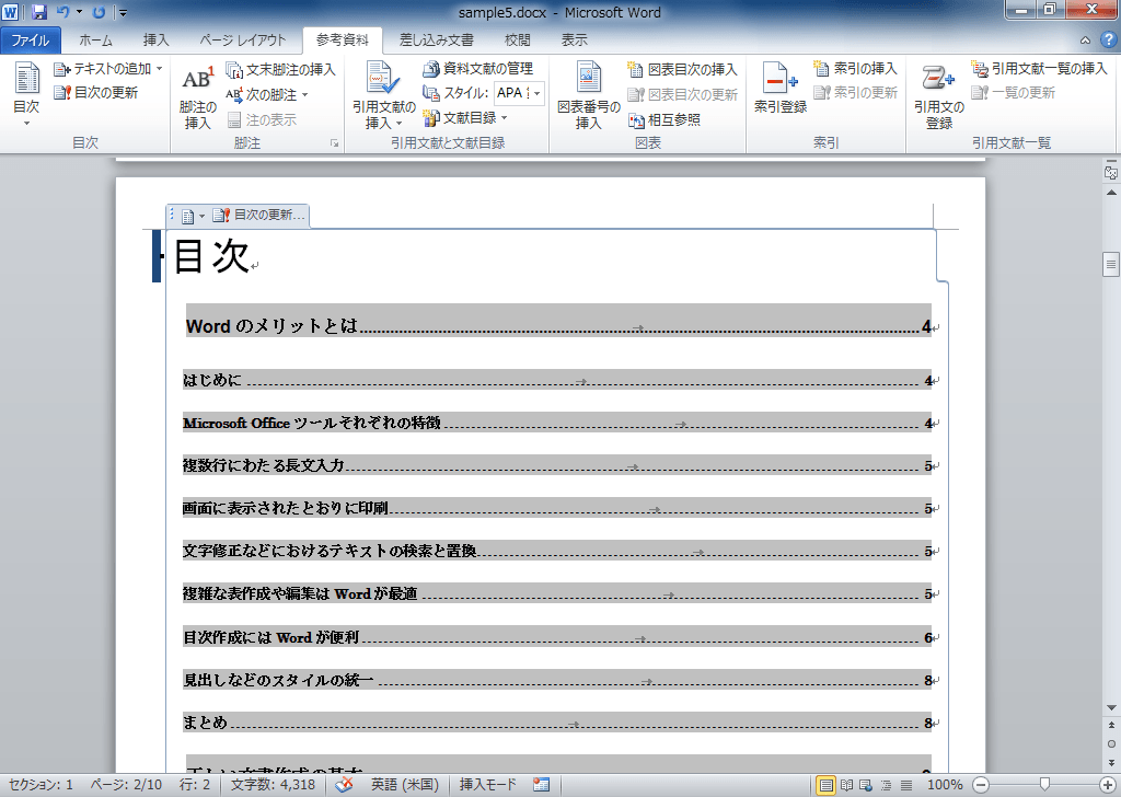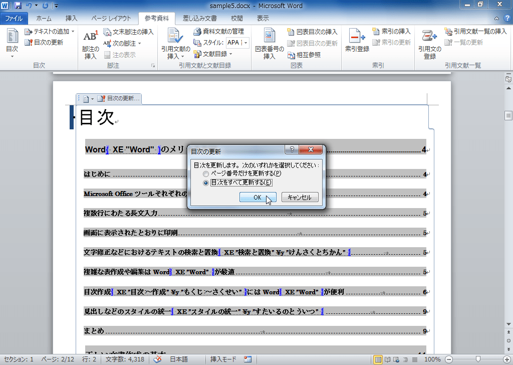 すでに表紙や目次にも語句がリストに含まれている場合、自動索引登録を実行するとそれらもすべて登録されます。表紙の場合はXEフィールドを削除する必要がありますが、目次の場合、あとで目次部分を選択して[F9]キーを押して目次すべて更新します。表紙や目次は、索引作成後に作ると効率的です。