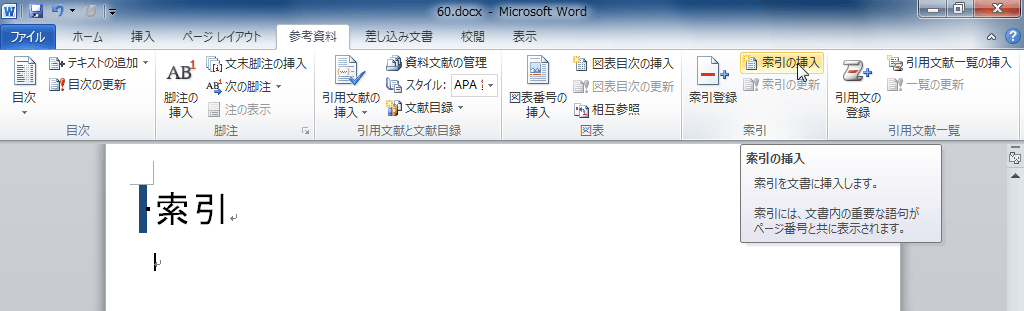 - [参考資料]タブを開き、[索引]グループの[索引の挿入]をクリックします。