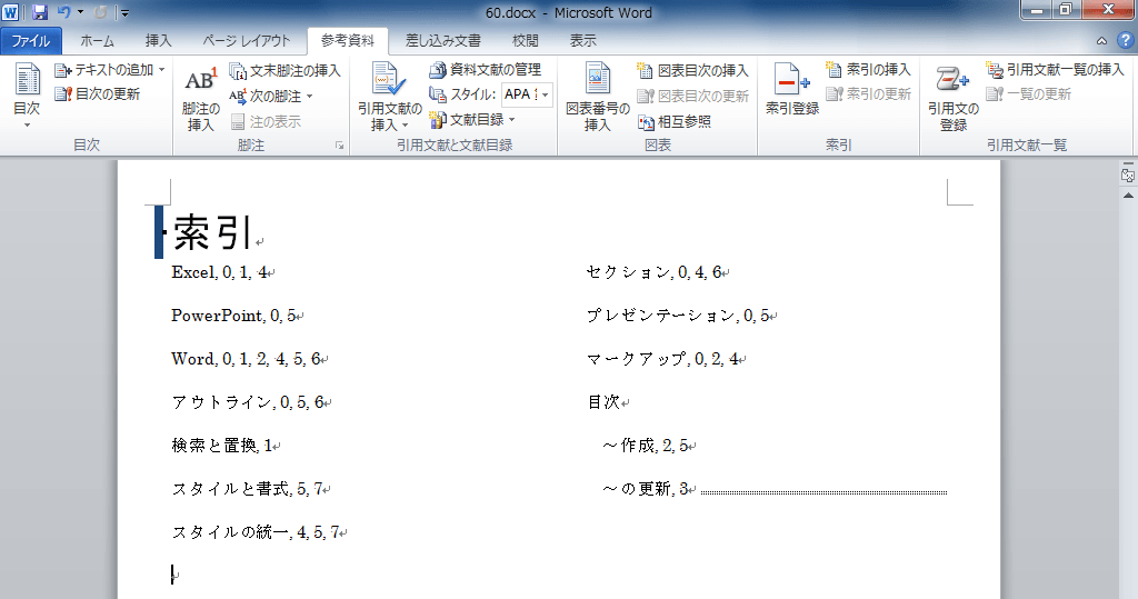 索引に出力する項目を登録できたら、索引を挿入する場所にカーソルを移動して[参考資料]タブを開き、[索引]グループの[索引の挿入]をクリックして、[索引]ダイアログボックスにて段数、タブリーダー、書式などを指定します。