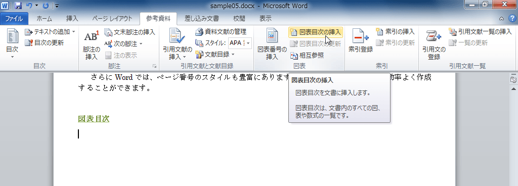 - [図表]グループの[図表目次の挿入]をクリックします。