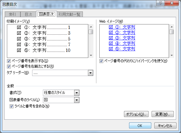 - [図表目次]ダイアログボックスにて任意に設定を変更して[OK]ボタンをクリックします。