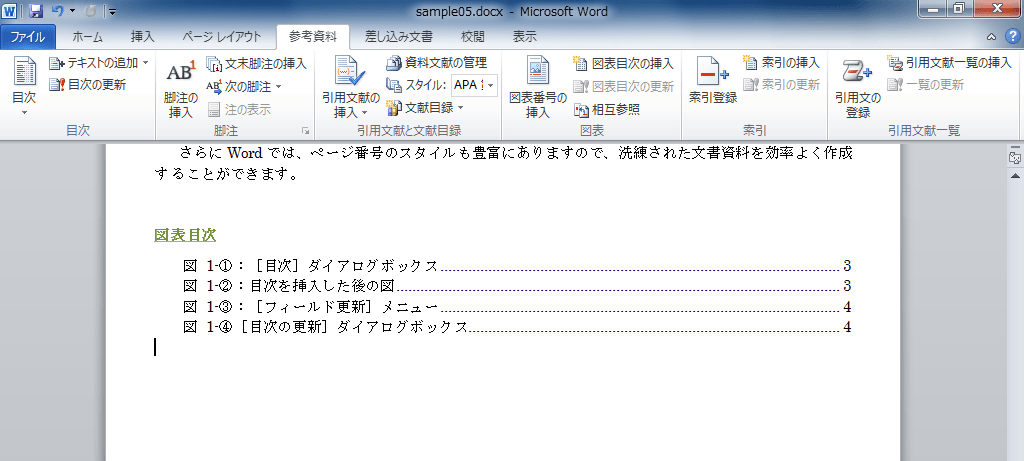 - 図表目次を挿入したい場所にカーソルを移動します。