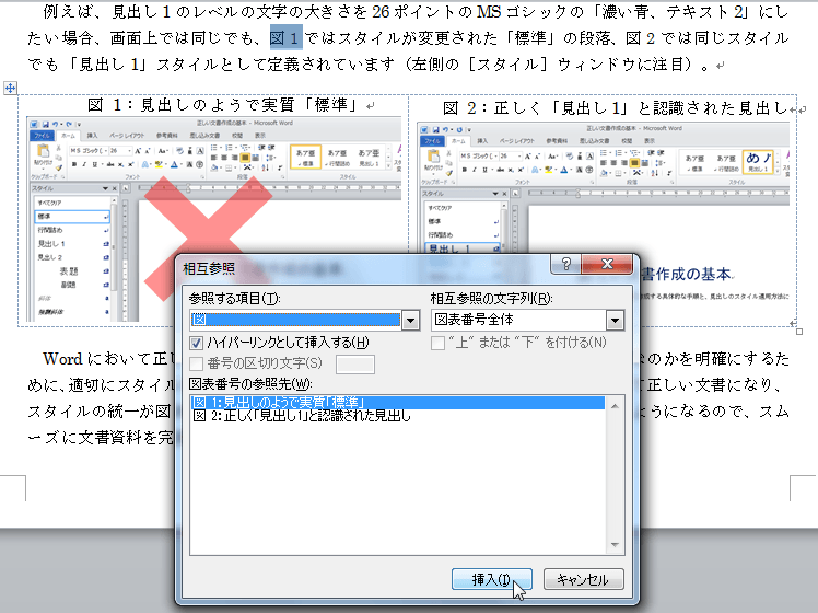 相互参照フィールド全体を選択し、[相互参照の文字列]を[図表番号全体]にして[挿入]をクリック