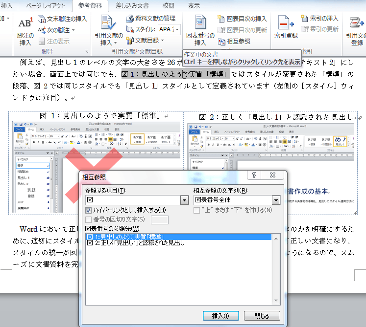 相互参照は、「図2を参照」などのように、文書内の他の場所にある項目を参照します。相互参照は、見出し、脚注、ブックマーク、図表番号、番号のついた段落などについて作成できます。