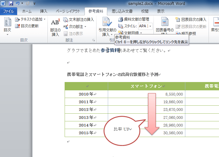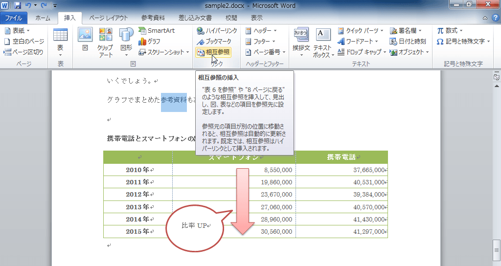 - [挿入]タブを開き、[リンク]グループの[相互参照]をクリックします。