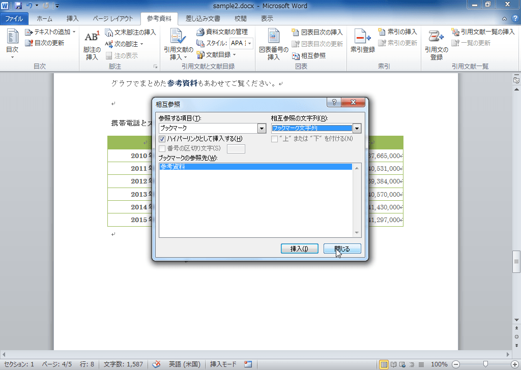 - ブックマークの文字列が相互参照として挿入されました。[閉じる]ボタンをクリックします。