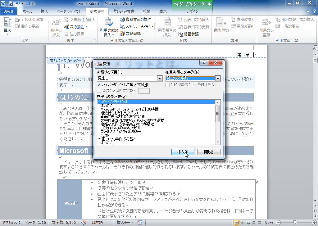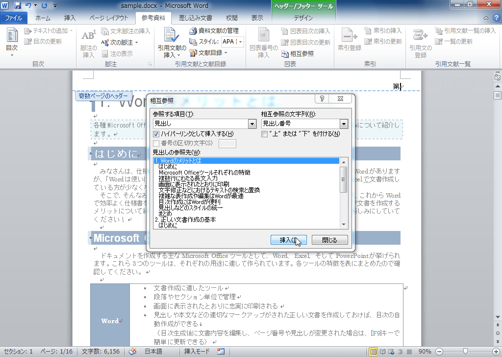 - 見出し番号を入れるには、[相互参照]ダイアログボックスの[参照する項目]を「見出し」に設定し、[相互参照の文字列]を「見出し番号」に設定して、見出しの参照先を選択し、[挿入]ボタンをクリックします。