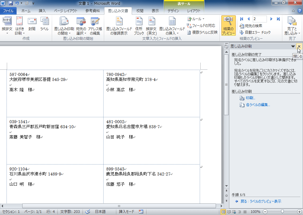 - 宛名ラベルに差し込み印刷する準備ができたことを確認します。ここで印刷したり、宛先を編集したりできます。この作業ウィンドウを閉じるには右上の[閉じる]ボタンをクリックします。