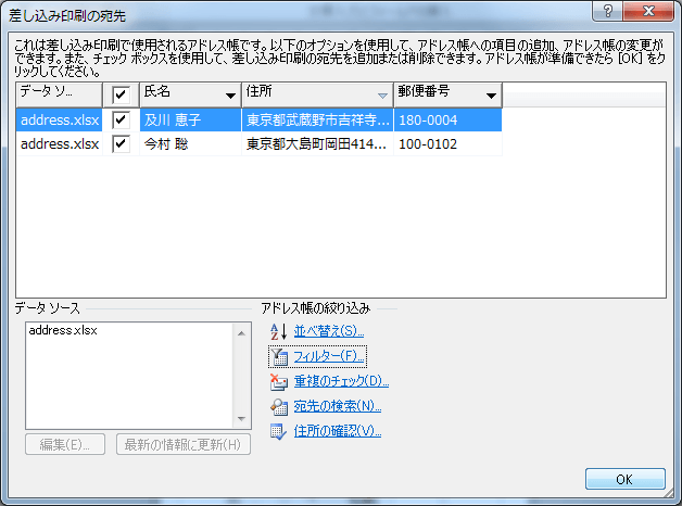 - [差し込み印刷の宛先]ダイアログボックスの右下の[フィルタ]をクリックします。