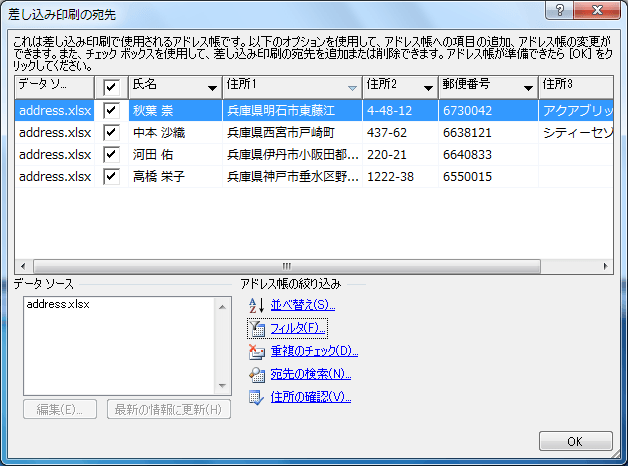 - [差し込み印刷の宛先]ダイアログボックスの[フィルタ]をクリックします。