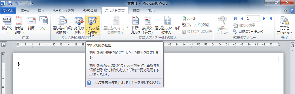 - [差し込み文書]タブの[差し込み印刷の開始]グループにある[アドレス帳の編集]をクリックします。