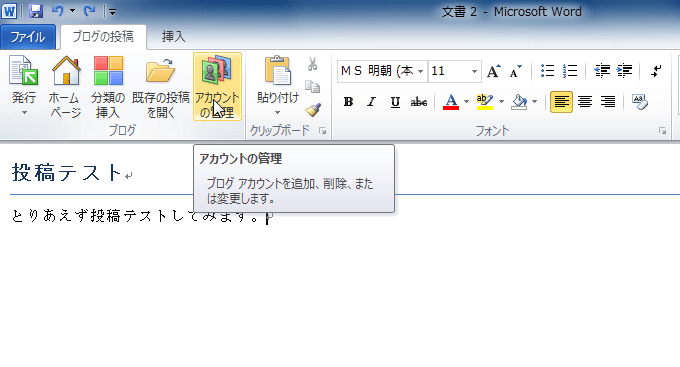 - [ブログの投稿]タブを選択し、[ブログ]グループの[アカウントの管理]をクリックします。