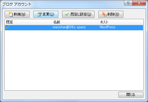 - [ブログアカウント]ダイアログボックスが開いたら、変更したいアカウントを選択して[変更]ボタンをクリックします。