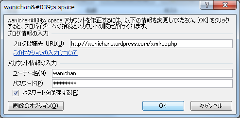 - ブログの投稿先URL、ユーザー名、パスワードを確認または変更して[OK]ボタンをクリックします。