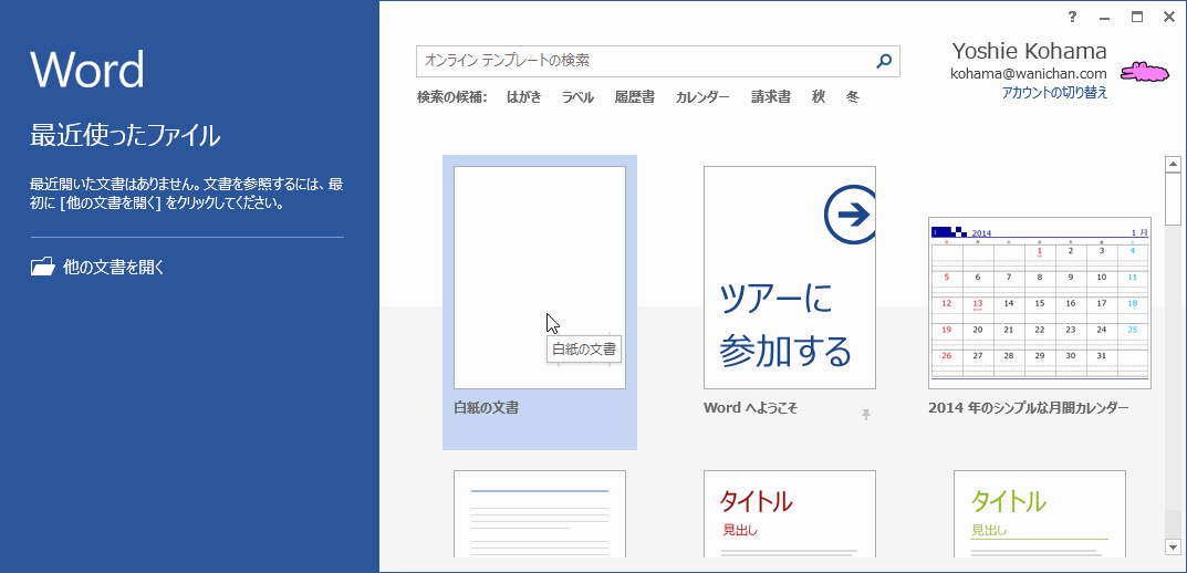 Word 2013が起動したら、[白紙の文書]を選択します。