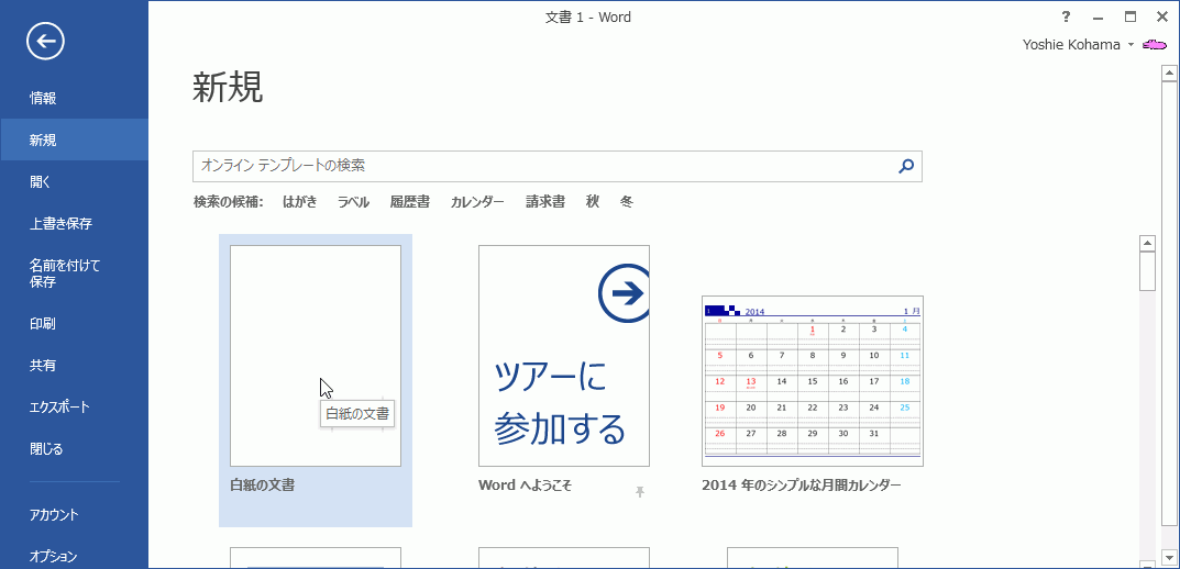 - [新規]タブを選択し、[白紙の文書]を選択します。