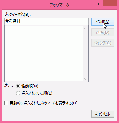 - [ブックマーク名]ボックスにブックマーク名を入力します。ここでは「参考資料」と入力します。