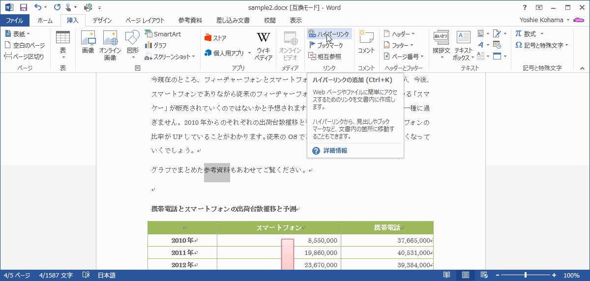 - [挿入]タブを開き、[リンク]グループの[ハイパーリンク]をクリックします。