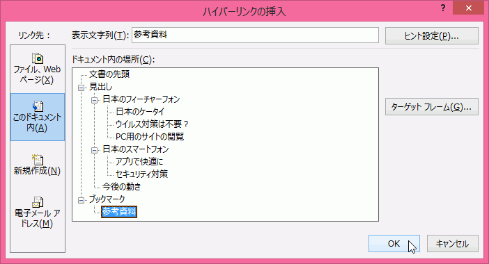 Word 2013でまず、ジャンプ先にブックマークを挿入して、[ハイパーリンクの挿入]ダイアログボックスにて[このドキュメント内]の一覧からブックマーク名を指定します。