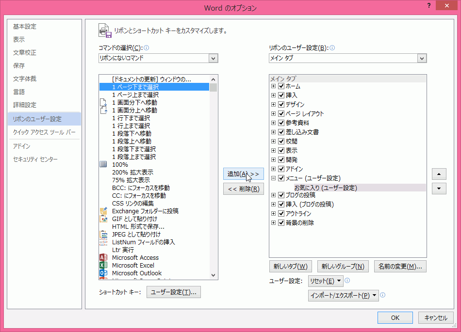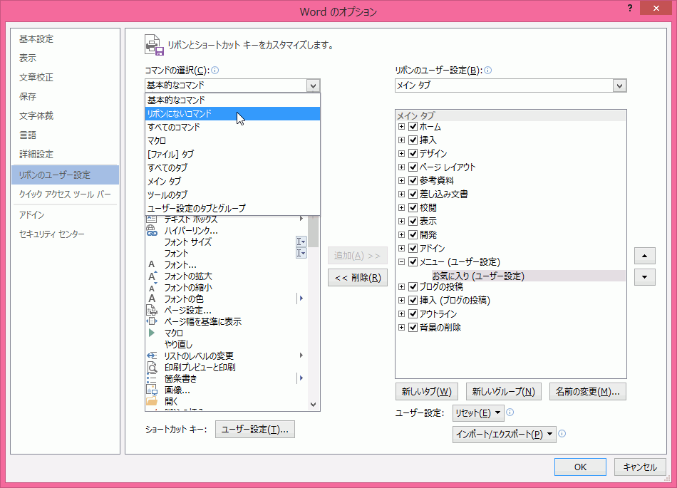 - [Wordのオプション]ダイアログボックスの[リボンのユーザー設定]を開きます。