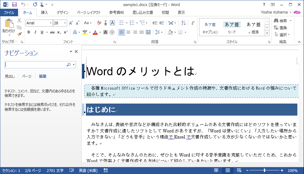 通常の語句の検索はナビゲーションウィンドウの[文書の検索]タブで行えますが、あいまい検索の場合は[検索と置換]ダイアログボックスの[検索]タブにて操作します。
