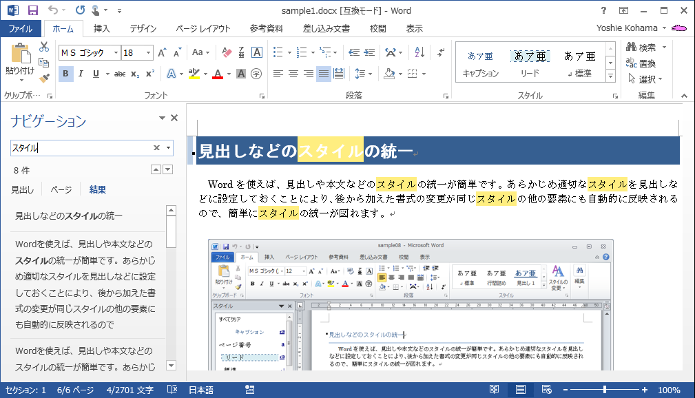 - ナビゲーションウィンドウの[文書の検索]ボックスに「スタイル」と入力します。
