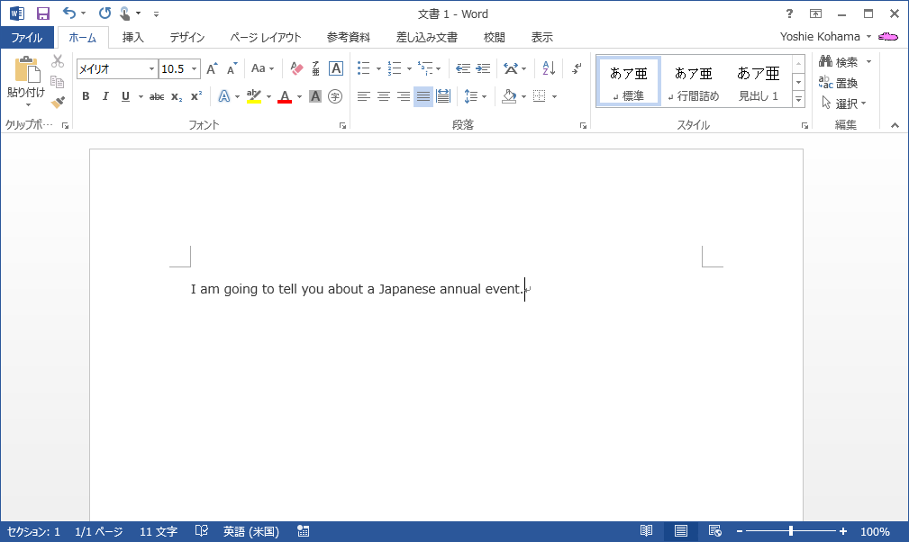 I am going to tell you about a Japanese anual event. (これから日本の一つの年中行事について話します)という英文をWord 2013に入力してみましょう。