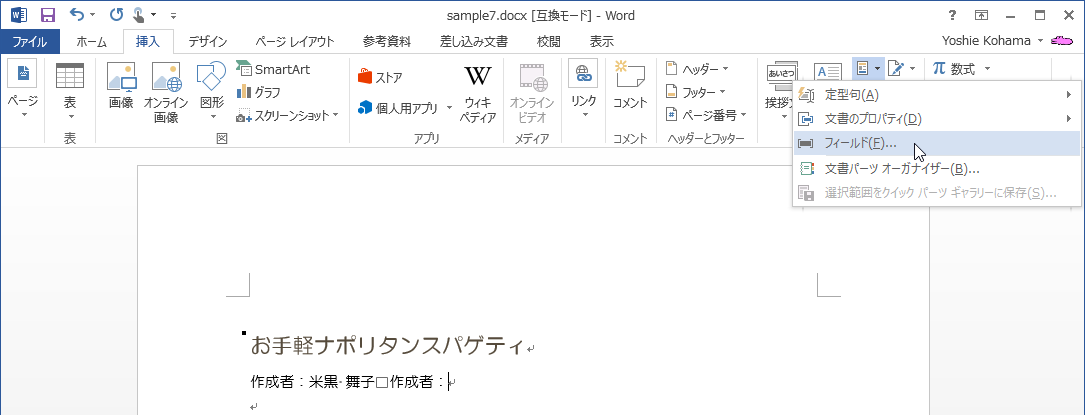 - [挿入]タブを開き、[テキスト]グループの[クイックパーツ]をクリックして、一覧から[フィールド]をクリックします。