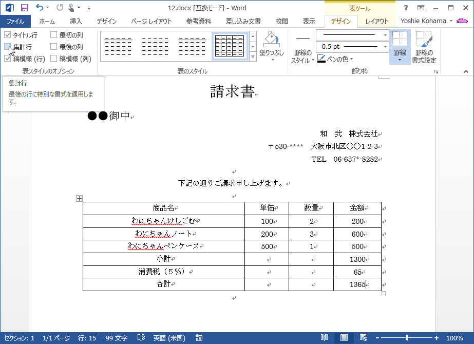 - [表スタイルのオプション]グループから[集計行]にチェックを付けます。