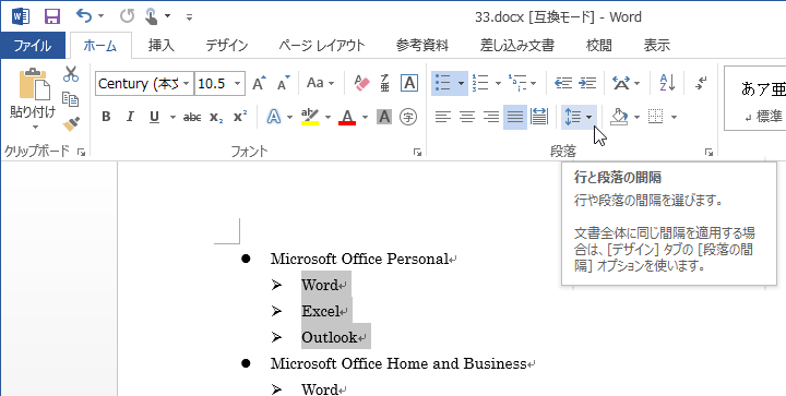 - 行間を変更したいリストを選択して[ホーム]タブの[段落]グループの[行と段落の間隔]を選択します。