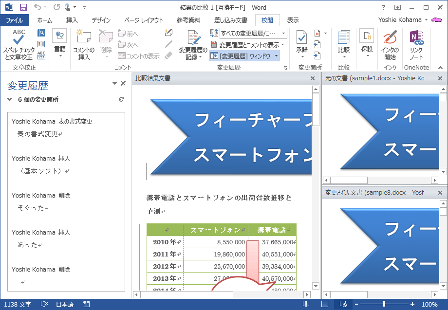 - 新しい文書が表示され、元の文書内の変更履歴は反映されて、変更された文書に加えられた変更だけが変更履歴として表示されます。ただし、比較対象の文書自体は変更されません。比較結果文書を下方向にスクロールすると…