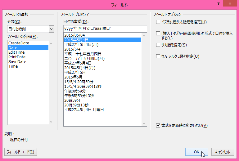 日付や時刻のフィールドを挿入する方法は、『組み込みのフィールドを挿入するには』ですでに触れました。日付の書式は、独自に書式を設定も可能です。