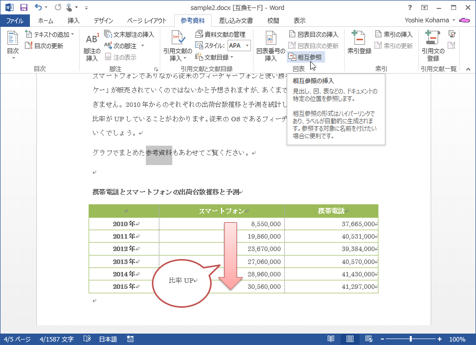 - [挿入]タブを開き、[リンク]グループの[相互参照]をクリックします。