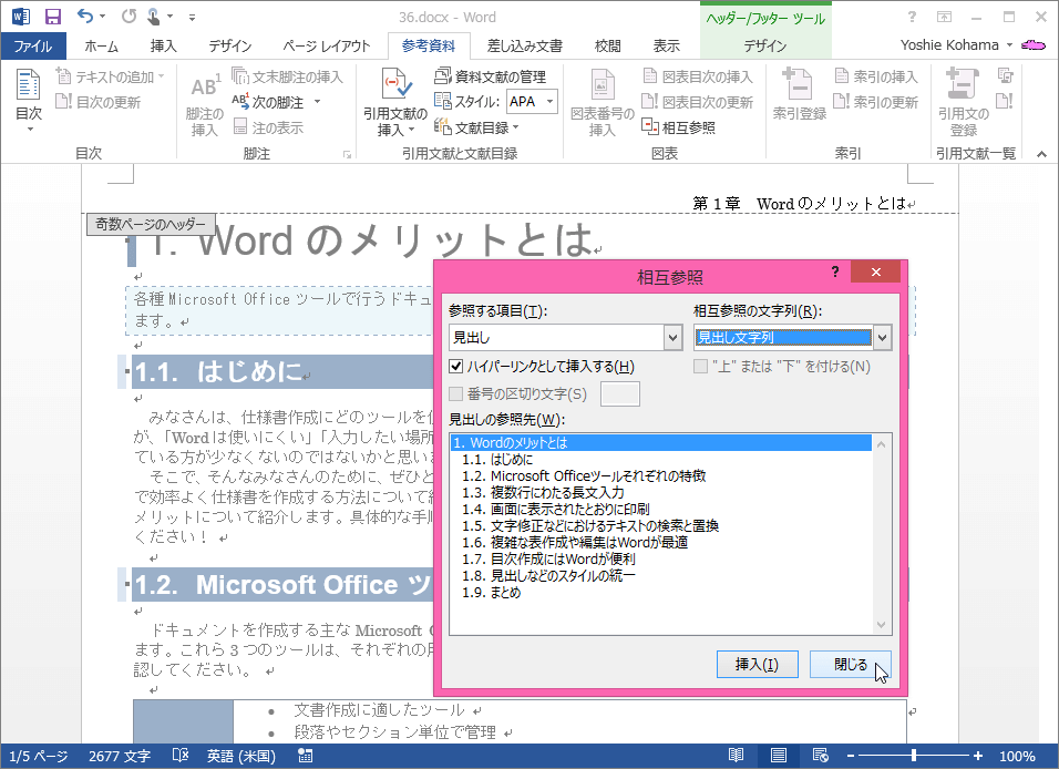 - 見出し番号を入れるには、[相互参照]ダイアログボックスの[参照する項目]を「見出し」に設定し、[相互参照の文字列]を「見出し番号」に設定して、見出しの参照先を選択し、[挿入]ボタンをクリックします。
