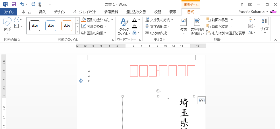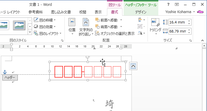 郵便番号枠は右上の画像をコピーして、ヘッダーとフッター領域に貼り付け、その画像の配置を[行内]以外にしてから、所定の位置までドラッグします。