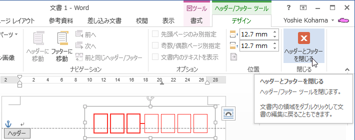 - ヘッダーとフッターの編集を終了するには、タイトルバー右側にある緑帯の[ヘッダー/フッター]ツールをクリックし、[ヘッダーとフッターを閉じる]をクリックするか、本文部分をダブルクリックします。