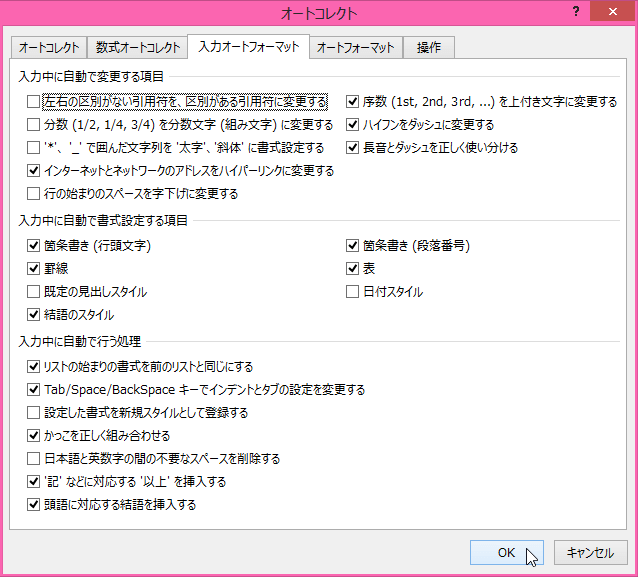 - [オートコレクトのオプション]ダイアログボックスの[入力オートフォーマット]タブを開きます。