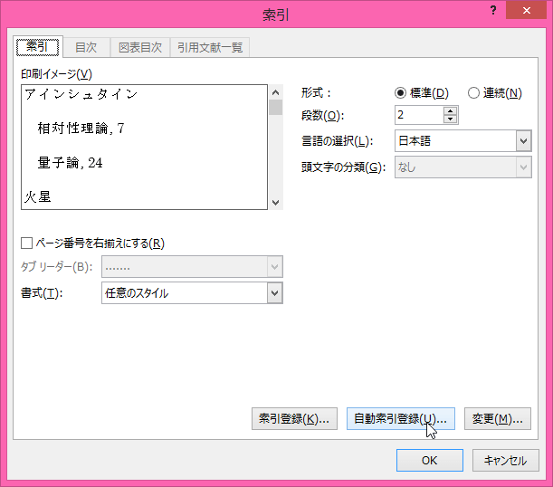 - [索引]ダイアログボックスの[自動索引登録]ボタンをクリックします。