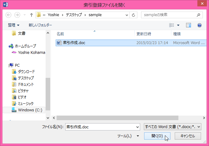 - [索引登録ファイルを開く]ダイアログボックスで、そのファイルを選択して[開く]ボタンをクリックします。