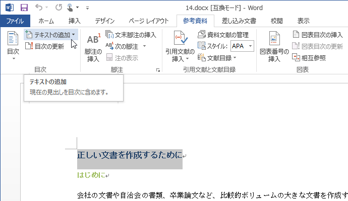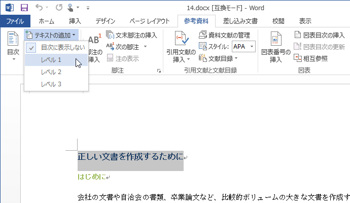見出しの書式を設定していない文字列を目次に含める場合は、目次に含める文字列を選択し、[参考資料]タブの[目次]グループの[テキストの追加]をクリックして、該当するレベルを選択します。