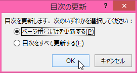 - [目次の更新]ダイアログボックスが表示されたら、[ページ番号だけを更新する]が選択されているのを確認し[OK]ボタンをクリックします。