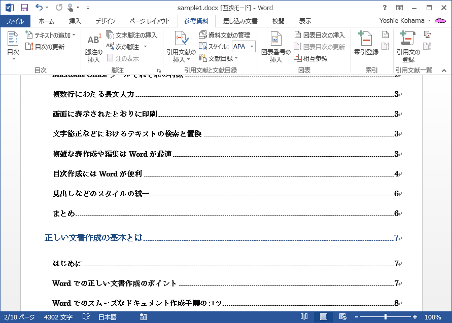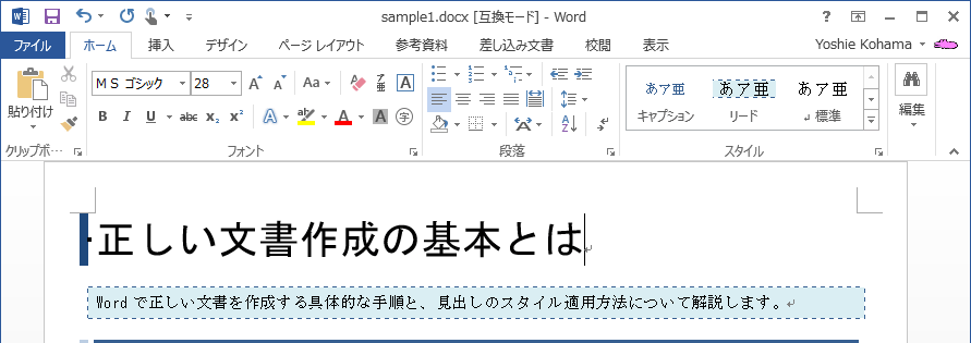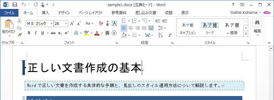 - サンプルファイルを開いて、「正しい文書作成の基本」から「正しい文書作成の基本とは」に変更します。