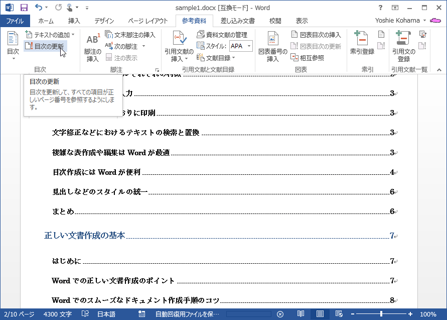 目次に記載されている見出しに変更があった場合は、ページ番号だけではなく目次すべて更新する必要があります。[参考資料]タブを開き、[目次の更新]をクリックして、[目次をすべて更新する]を選択します。
