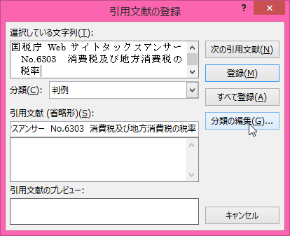 [引用文献の登録]ダイアログボックスが表示されたら[分類]ボックス一覧から分類を選択します。もし一覧にない場合は[分類の編集]ボタンをクリックします。